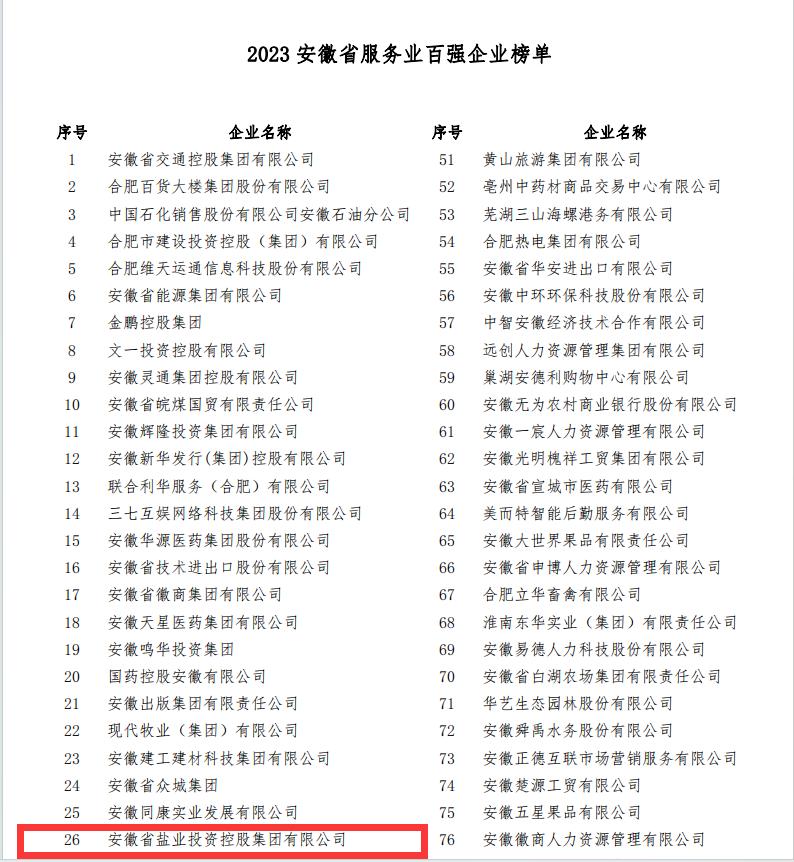 省生態(tài)環(huán)境集團(原省鹽業(yè)集團)入選“2023安徽省百強企業(yè)”榜單,位列第87位;入選“2023安徽省服務(wù)業(yè)百強企業(yè)”榜單,位列第26位。這是我公司連續(xù)第4年入選省百強企業(yè)榜單、省服務(wù)業(yè)百強企業(yè)榜單。
