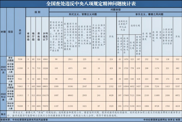11月27日,中央紀委國家監(jiān)委公布了2022年10月全國查處違反中央八項規(guī)定精神問題匯總情況。今年10月,全國共查處違反中央八項規(guī)定精神問題7558起,批評教育幫助和處理11050人,其中,黨紀政務(wù)處分7541人,這是連續(xù)第110個月公布月報數(shù)據(jù)。