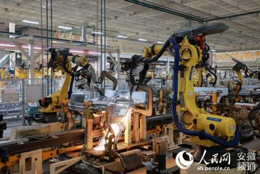 江汽集團(tuán)生產(chǎn)線。圖為機(jī)器人正在進(jìn)行焊接。人民網(wǎng) 王曉飛攝