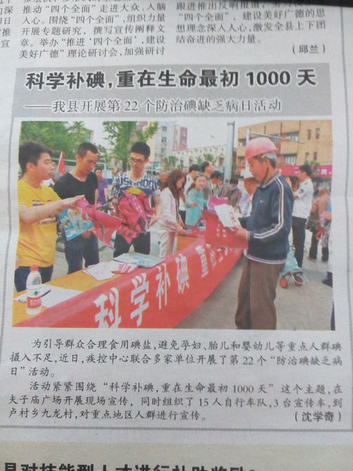 《今日廣德報(bào)》:科學(xué)補(bǔ)碘,重在生命最初100天 ——我縣開展第22個(gè)防治碘缺乏病日活動(dòng)