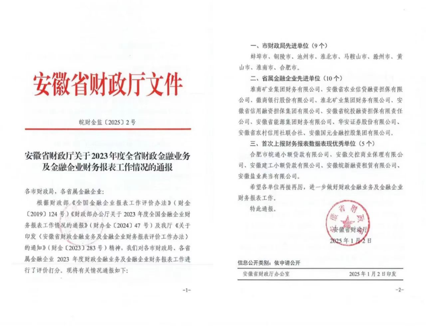 近日,安徽省財政廳依據(jù)《全國金融企業(yè)報表工作評價辦法》等相關(guān)文件精神,對各市財政局和省屬金融企業(yè)2023年度財政金融業(yè)務(wù)及金融企業(yè)財務(wù)報表工作進行了評價。徽鹽典當公司榮獲“首次上報財務(wù)報表數(shù)據(jù)表現(xiàn)優(yōu)秀單位”榮譽稱號。